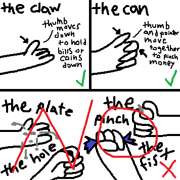 The bad examples above almost always cause change or bills to go flying or fall to the ground, and you to either have to leave
